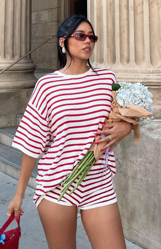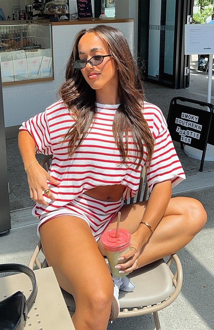 The All The Little Things Top Red Stripe is a must for your new season lounge collection. Features an over-sized look, no lining, slightly sheer, stretch material for an easy slip on design and full length. Style with All The Little Things Shorts and your favourite pair of sneakers for a cozy vibe!
