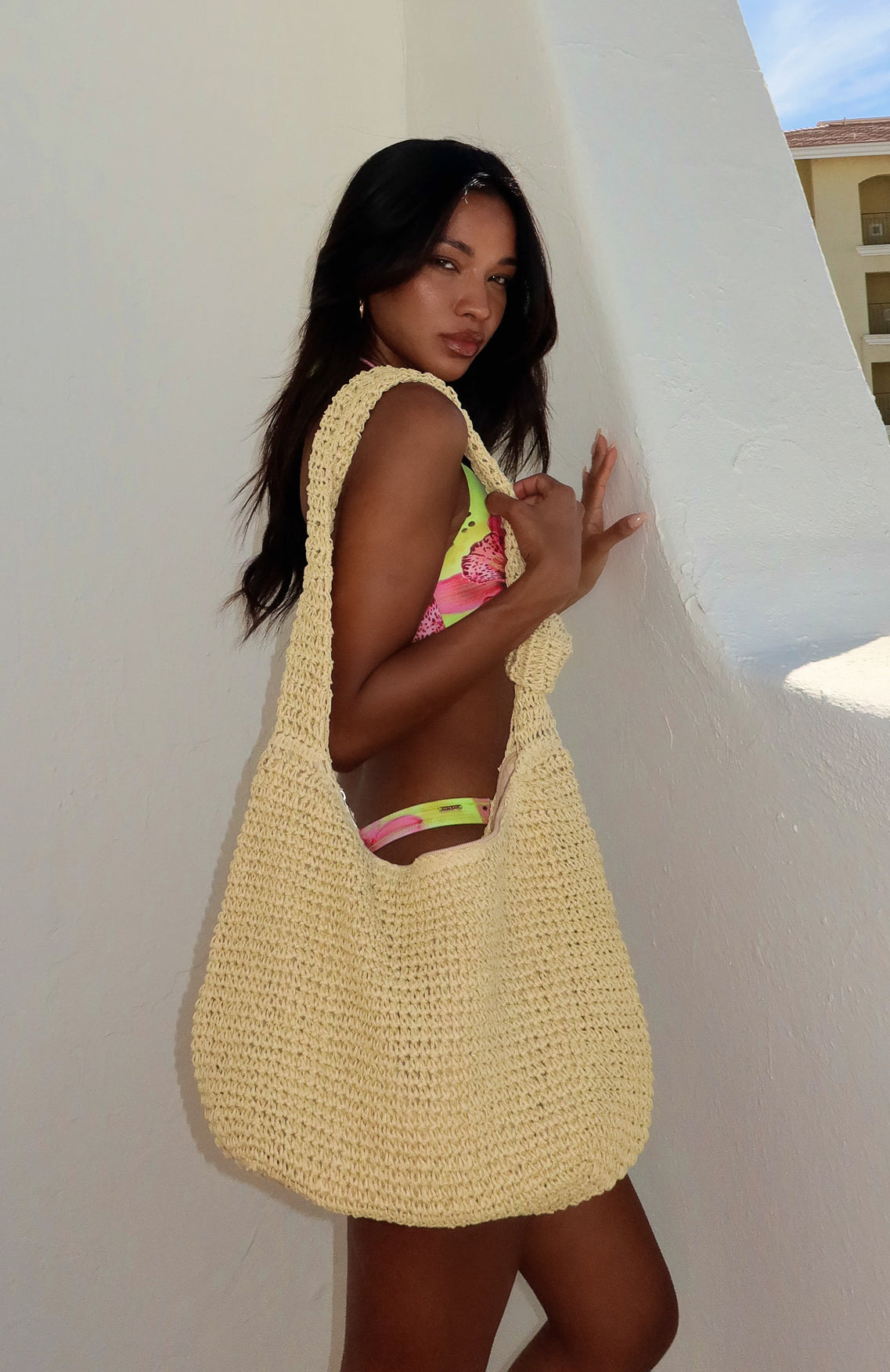 The Asher Shoulder Bag Natural is our new obsession! Features a large shoulder strap with knot detailing, top zipper closure and woven material. Pair with a sarong and bikinis for the perfect beach to bar look!