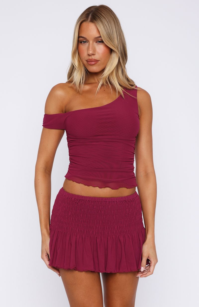 The simplicity of sets made elevated. Welcome the Break The Limits Top in Berry. Features one shoulder neckline, thick straps, ruched detailing on side and stretch fabrication for an easy slip on and off. Complete the look with the matching Break The Limits Shirred Mini Skirt in Berry for a fit we love!