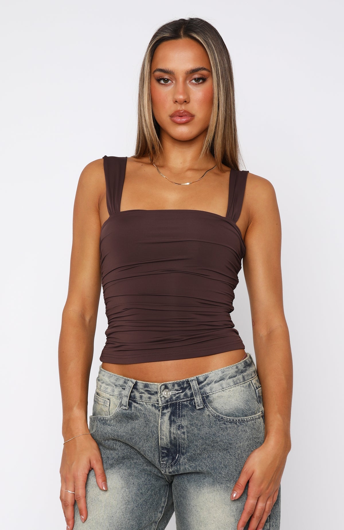 The weekend is calling and the In The Open Top Espresso is here to answer. Features a low cut neckline, thick straps stretch straps, lined fabric, side ruched design and stretch for an easy slip on design. Pair with the matching Late Nights Mini Skirt for a super cute look!