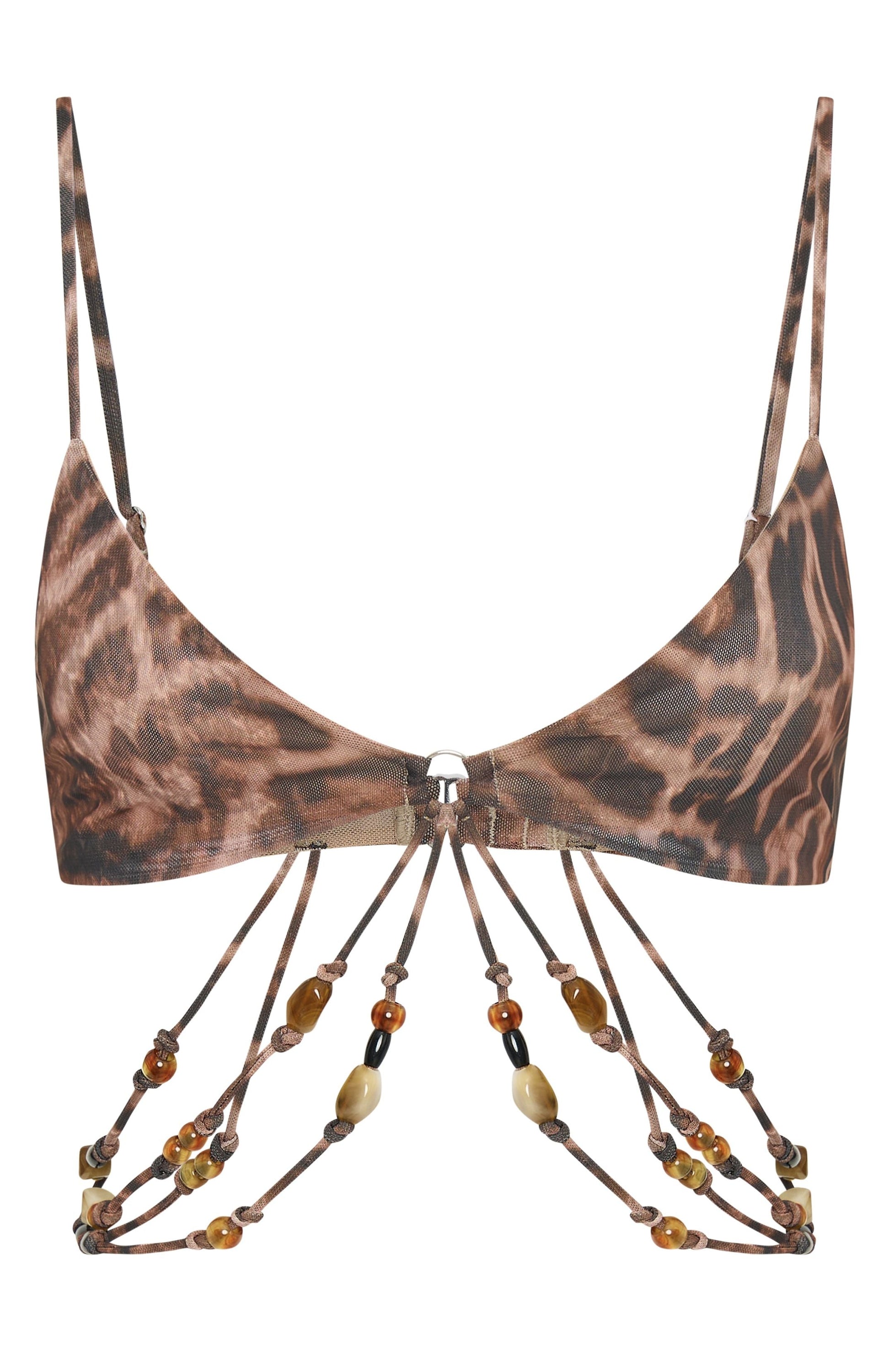 Ready to make an unforgettable statement? The Lunar Dreams Top The Wild Print features thin, elasticated shoulder straps, mesh lined, slightly sheer, back hook and loop closure, stretch material and beaded detailing. We love this styled with the Lunar Dreams Pants!