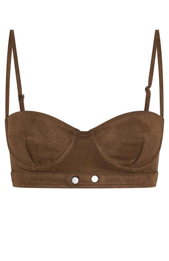 Catch us stage front in the Never Going Back Crop Chocolate. Featuring thin, adjustable shoulder straps, bust underwire, unlined, front stud detailing, ultra cropped length and back zipper and clasp closure. Pair with the Never Going Back Pants for a dance floor approved fit!