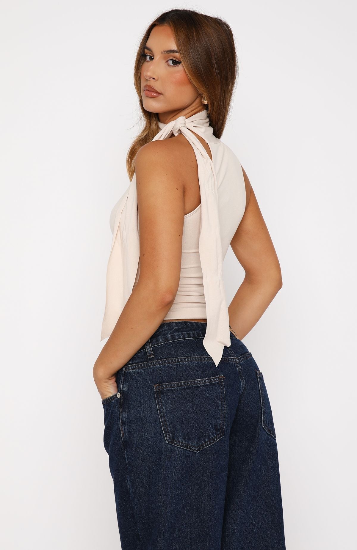 You don't want to miss adding this stylish staple to your wardrobe! The Spilling Secrets Top Bone features a high neck design with adjustable self tie strap, cropped length, unlined, and stretch material for an easy slip on design. Style with low rise jeans and your favourite gold accessories!