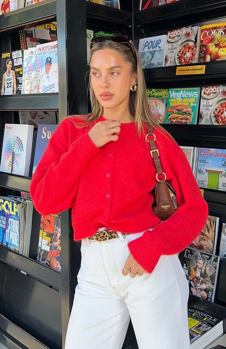 Say hi to your new favourite cardi! The Warm Whispers Knit Cardigan Red features a high neckline, front button closure, cropped fit with ribbing at hemline, drop shoulder and super soft, cosy knit fabric. Looks best paired with a cute boot and White Fox jeans for an instagram worthy fit'!